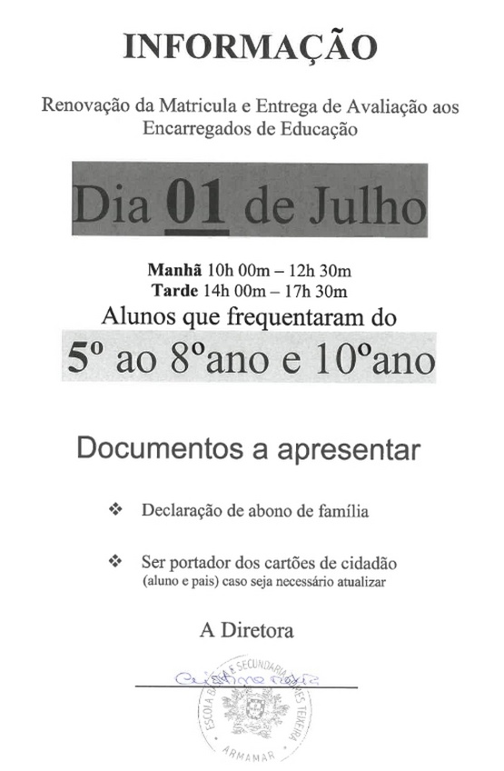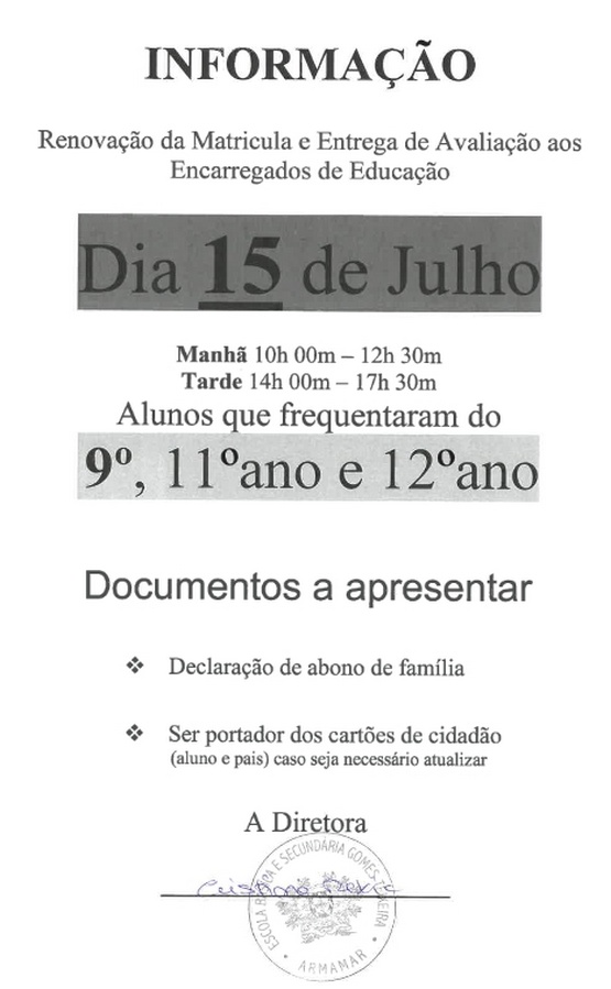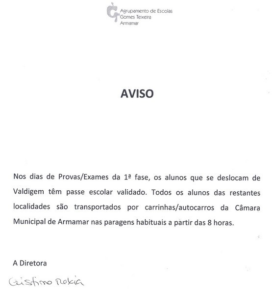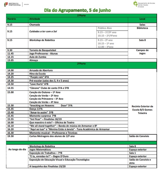 Aviso - TransportesNos próximos dias, aproximando-se a conclusão do ano letivo, desenvolvem-se na escola atividades escolares de caráter formativo, substituindo no dia 5 de junho e 7 de junho as atividades letivas, conforme as informações e programa que se anexa. No dia 5 de junho, na Escola Básica e Secundária Gomes Teixeira, ao longo do dia poderá visitar exposições, assistir a eventos desportivos e artísticos e partilhar momentos de convívio com toda a comunidade escolar. No dia 7 de junho, o dia será de uma Caminhada Saudável dos alunos do 5º ao 12º ano, sendo cada turma acompanhada por docentes e não docentes, da escola até ao Monte de S. Domingos, em Fontelo, onde se fará uma refeição ligeira e se partilharão momentos de convívio com jogos tradicionais. A atividade será acompanhada pelos Bombeiros Voluntários de Armamar. Os alunos devem trazer roupa e calçado confortável, boné/chapéu e água. Poderão trazer uma pequena merenda, ou adquirir a senha habitual da refeição escolar, que nesse dia será constituída por duas sandes com carne e peça de fruta. À tarde, os transportes escolares recolhem os alunos no Monte de S. Domingos. No dia 14 de junho, o ano letivo encerrará com o espetáculo de artes performativas - teatro, dança, música - "Os Loucos Anos 20", dinamizado pelo Clube/Oficina de Teatro e Grupo de Danças Rítmicas e Expressivas do Desporto Escolar, inserido no Projeto Inovador de Combate ao Insucesso do Município de Armamar e com a participação da Banda dos Bombeiros Voluntários de Armamar e outros membros da comunidade. Antes, poderá ainda visitar a exposição " Planeta Azul...Até quando?" e deliciar-se com petiscos, numa atividade de angariação de fundos dos alunos finalistas de 2019-2020. Esperamos por si! Aproveitamos ainda esta oportunidade para agradecer a todos os Pais e Encarregados de Educação que ao longo do ano se empenharam para com a Escola promover a formação e o sucesso escolar dos nossos jovens. Até breve!