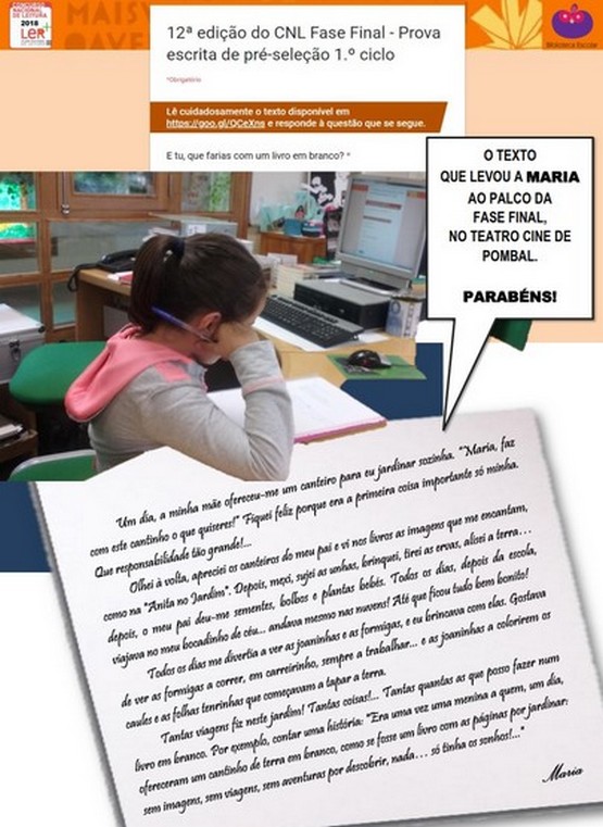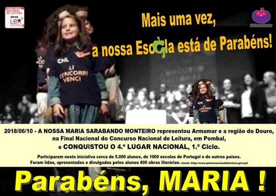 Mais uma vez, a Nossa Escola esteve em destaque no mais importante Concurso de Leitura de Portugal: o CONCURSO NACIONAL DE LEITURA, do PNL.Num espetáculo de elevado valor cultural, gravado pela RTP, o Agrupamento de Escolas Gomes Teixeira, de Armamar, teve uma aluna do 1.º Ciclo, Maria Sarabando Monteiro, a defender o concelho e a região do Douro. E fê-lo da melhor forma, lendo e argumentando em palco, perante centenas de assistentes, um poema de Almada Negreiros, de exaltação de Portugal, dos portugueses e de Luís Vaz de Camões.Os aplausos nunca serão demais para a Maria! Parabéns!!